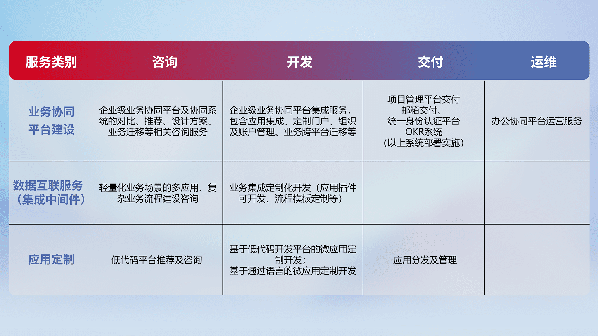 针对钉钉、、、、企微、、IDaas等平台级产品提供产品的规划、、方案、、、、交付、、定制化开发等服务,,,实现如统一协同办公、、、、智能客户服务、、、混合会议管理、、智能数据查询、、等业务场景,,,实现数字化转型。。。。